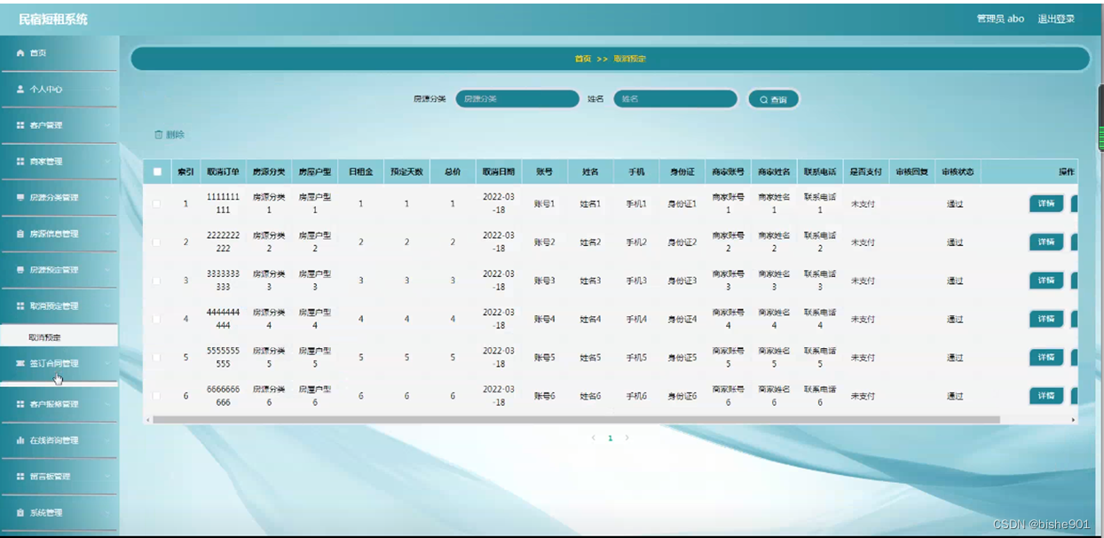 取消预订管理,在取消预订页面可以对索引,取消订单,房源分类,房屋户型,日租金,预定天数,总价,取消日期,账号,姓名,手机,身份证,商家账号,商家姓名,联系电话,是否支付,审核回复,审核状态等内容进行操作,如图5-10所示。