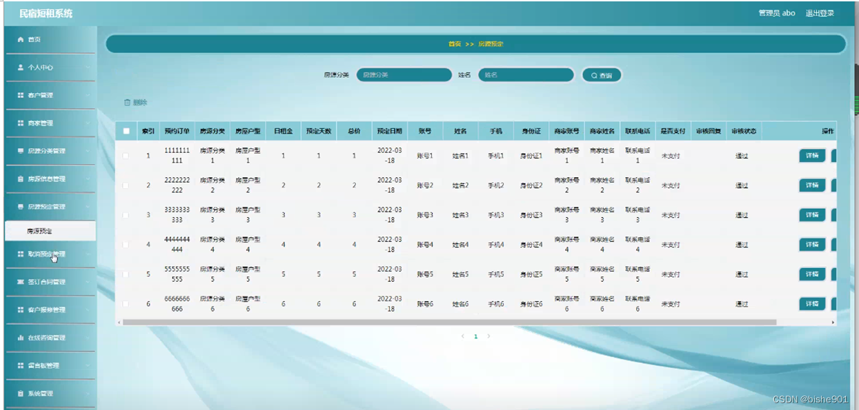 房源预订管理,在房源预定页面可以对索引,预约订单,房源分类,房屋户型,日租金,预定天数,总价,预定日期,账号,姓名,手机,身份证,商家账号,商家姓名,联系电话,是否支付,审核回复,回复状态等内容进行操作,如图5-9所示。