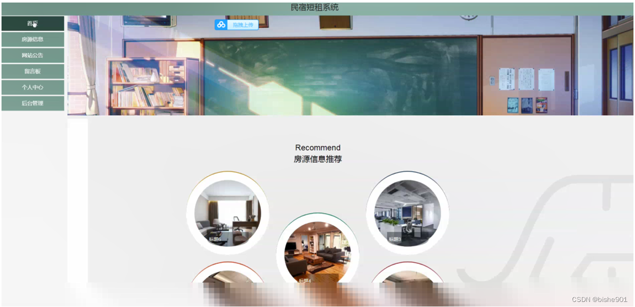 民宿短租系统,客户进入到系统首页,可以查看首页,房源信息,网站公告,留言板,个人中心,后台管理等内容进行操作,如图5-1所示。