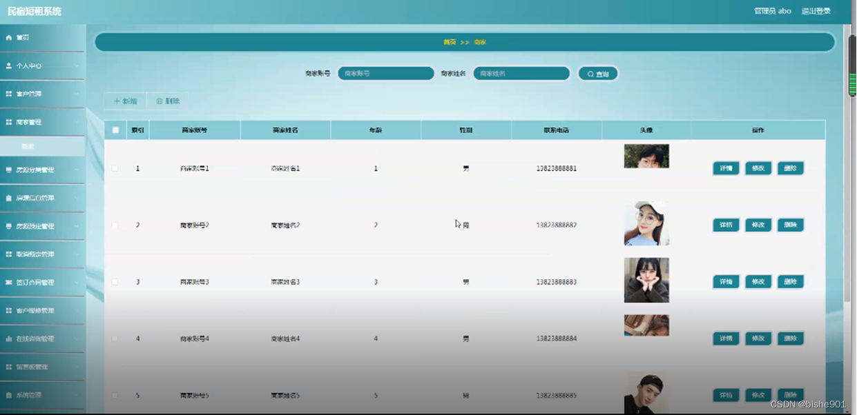 商家管理,在商家页面可以对索引,商家账号,商家姓名,年龄,性别,联系电话,头像等信息进行详情,修改和删除等操作,如图5-6所示。