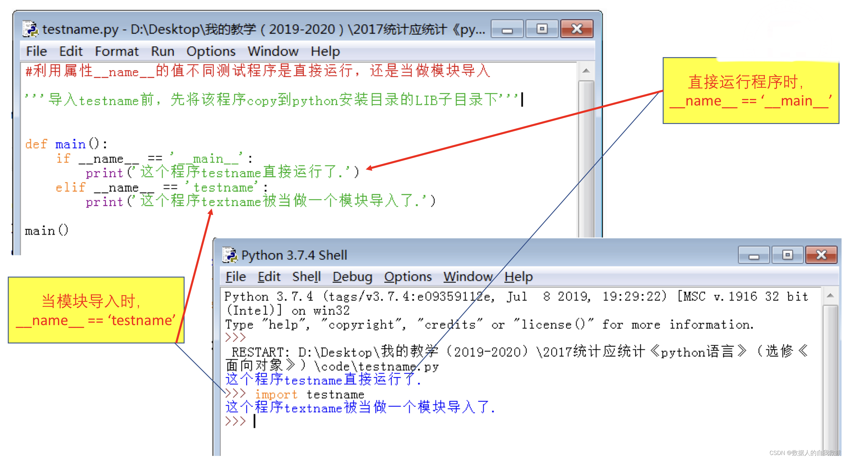 - 如果作为模块被导入,则其_name_属性的值被自动设置为模块名;(作为模块导入前,先将该程序copy到python安装目录的LIB子目录下)