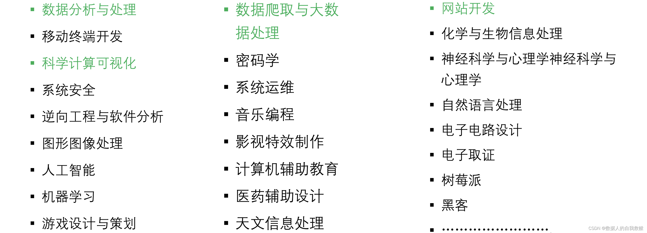 - 胶水语言:可以把多种不同语言编写的程序融合到一起实现无缝拼接,更好地发挥不同语言和工具的优势,满足不同应用领域的需求