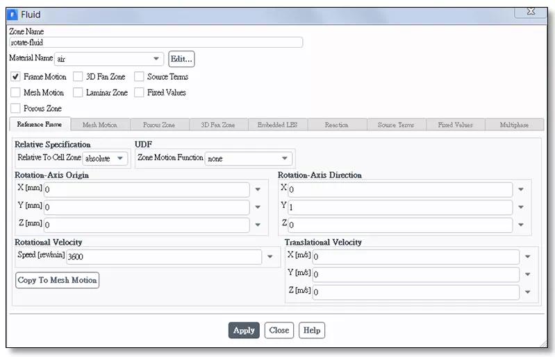 转速及转轴设置部份,在旋转流体区勾选Frame Motion,设置Rotational Velocity=3600 rev/min(RPM);Rotation-Axis Direction设置的是风扇转动方向,采右手定则,姆指为轴心,其余四指为叶片转动方向。
