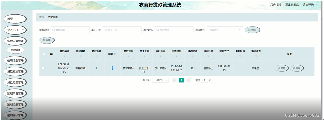 贷款申请管理;在贷款申请管理页面通过查看贷款编号、套餐名称、贷款金额、利率、贷款年限、员工工号、支行名称、申请时间、用户账号、用户姓名、联系方式、审核回复、审核状态等内容,进行详情、删除等操作;如图5-10所示。
