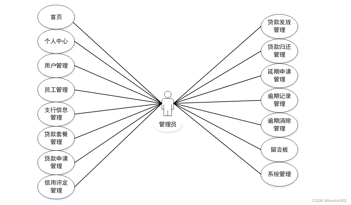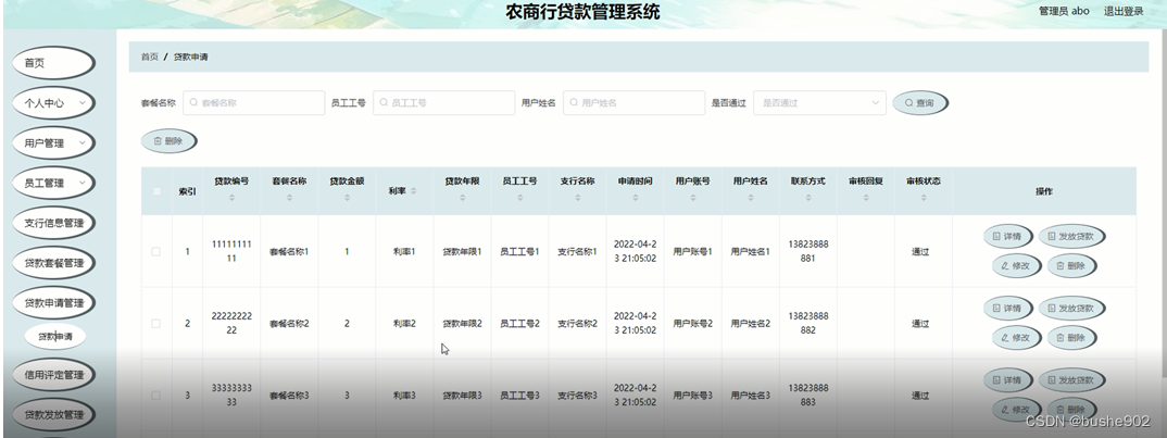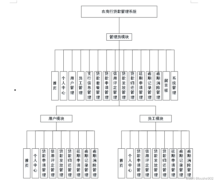 本课题要求实现一套农商行贷款管理系统,系统主要包括管理员模块、员工模块和用户模块功能模块。