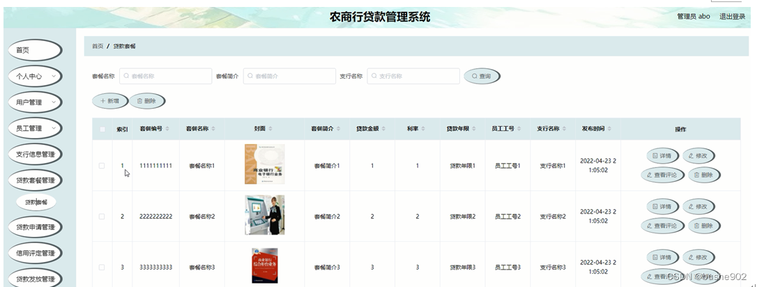 贷款套餐管理;在贷款套餐管理页面中可以查看套餐编号、套餐名称、封面、套餐简介、贷款金额、利率、贷款年限、员工工号、支行名称、发布时间等内容,并进行修改、删除等操作;如图5-7所示。