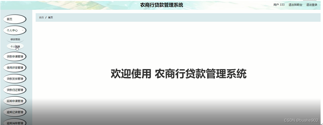 点击后台管理跳转到后台农商行贷款管理系统页面查看首页、个人中心、贷款申请管理、信用评定管理、贷款发放管理、贷款归还管理、延期申请管理、逾期记录管理、逾期消除管理等内容进行相应操作,如图5-9所示。