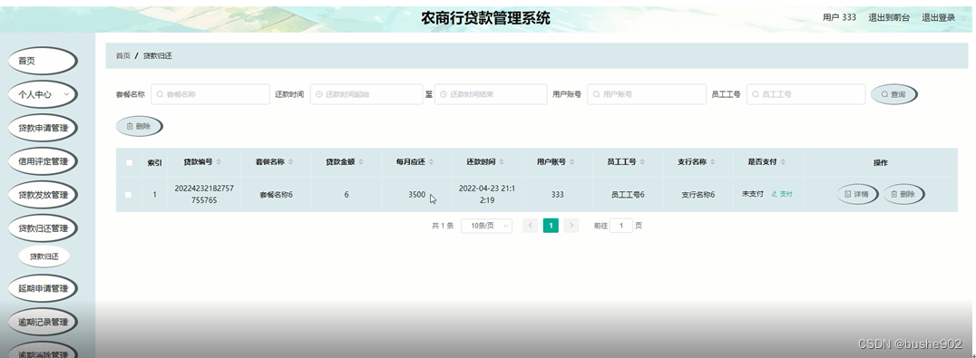 贷款归还管理;在贷款归还管理页面通过查看贷款编号、套餐名称、贷款金额、每月应还、还数时间、用户账号、员工工号、支行名称、是否支付等内容,进行详情、删除等操作;如图5-12所示。