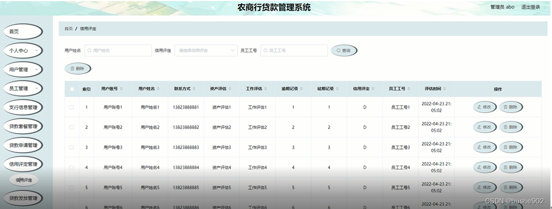 信用评定管理;在信用评定管理页面中可以查看用户账号、用户姓名、联系方式、资产评估、工作评估、逾期记录、延期记录、信用评定、员工工号、评估时间等内容,并进行修改、删除等操作;如图5-4所示。