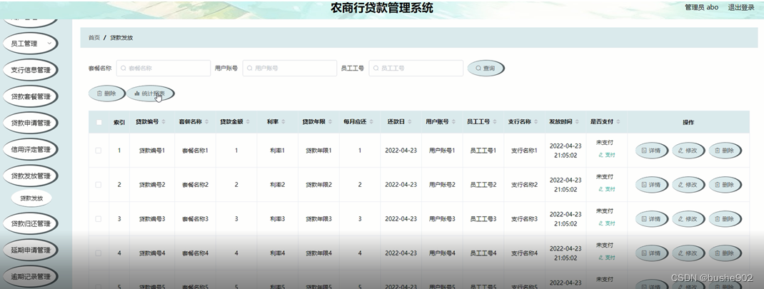 贷款发放管理;在贷款发放管理页面通过查看贷款编号、套餐名称、贷款金额、利率、贷款年限、每月应还、还数日、用户账号、员工工号、支行名称、发放时间、是否支付等内容,进行详情、删除等操作;如图5-11所示。