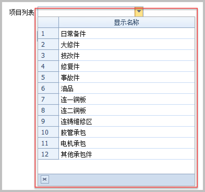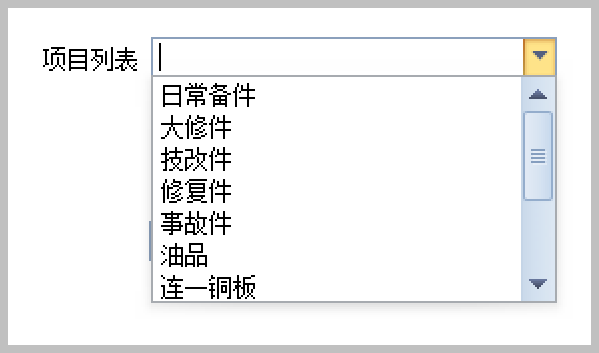 常规的处理方式,可能会使用ComboBoxEdit 控件来承载下拉列表,下拉列表的值可以是固定的列表,也可以来自字典的方式,具体根据实际情况而定,大概的效果如下所示。