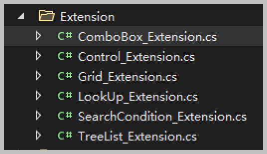而对于其他类似的下拉列表,如树形列表,带搜索的SearchLookupEdit等控件,我们也可以用类似的方式编写自定义的扩展函数,这样我们使用起来就非常方便的了。类似我们下面的做法方式,分门别类的对它们进行一些简单的封装处理。