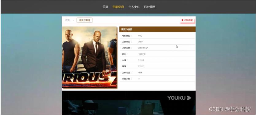 电影信息:通过活页面,可以获取电影名称、电影类型、封面、上映年份、上映日期、视频、时长、主演、导演、上映地区、电影详情、点击次数等信息,进行评论或收藏操作,如图5-3所示。
