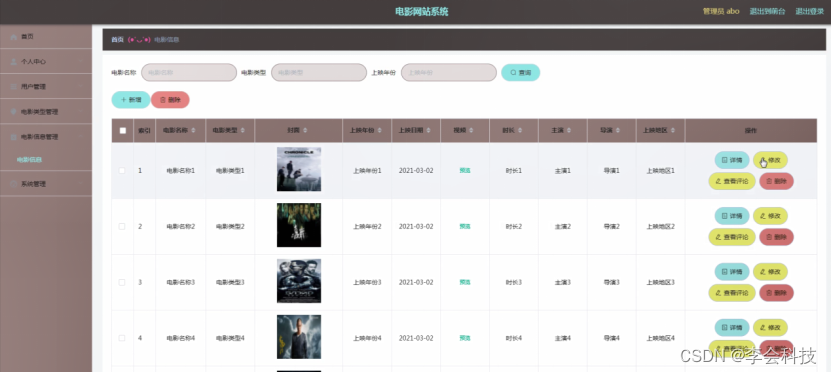 模块包括首页、个人中心、用户管理、电影类型管理、电影信息管理、系统管理等进行相应的操作。