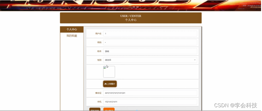 个人中心:在个人中心页面通过填写用户名、密码、姓名、性别、图片、身份证、手机等信息,进行更新操作,还可以根据需要对我的收藏进行相应操作;如图5-4所示。