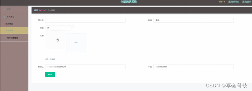 个人中心:在个人中心页面通过填写用户名、姓名、性别、头像、身份证、手机等信息进行修改操作,如图5-6所示。