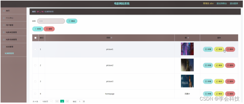 系统管理:通过轮播图列表可以获取索引、名称、值等信息,进行详情,修改或删除操作,如图5-13所示。