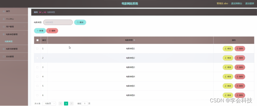 电影类型管理:通过列表可以获取索引、电影类型等信息,进行修改或删除操作,如图5-11所示。