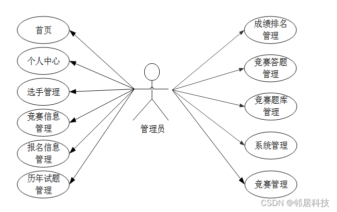 管理员登录之后,进入系统界面,可以对首页、个人中心、选手管理、竞赛信息管理、报名信息管理、历年试题管理、成绩排名管理、竞赛答题管理、竞赛题库管理、系统管理、竞赛管理等进行管理。管理员用例图如图3-2所示;