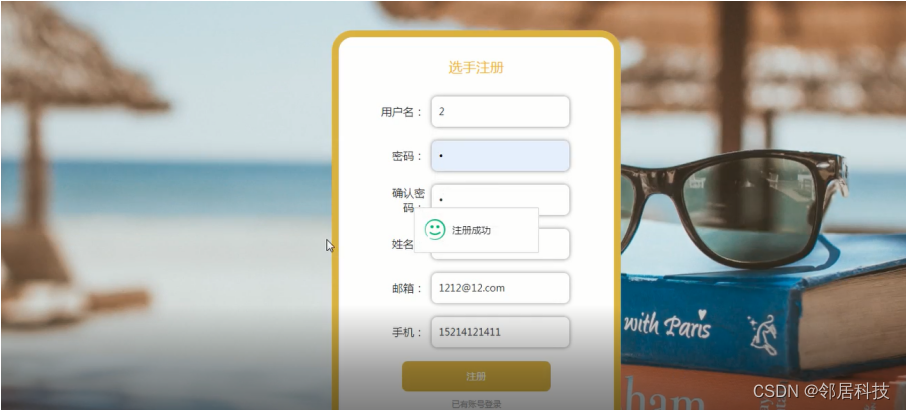 选手注册,在选手注册页面通过填写用户名、密码、确认密码、姓名、邮箱、手机等信息完成选手注册操作,如图5-2所示。