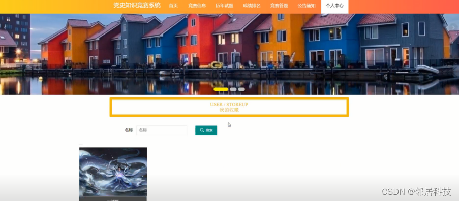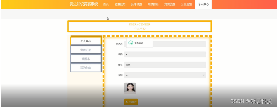 个人中心,在个人信息页面通过填写用户名、密码、姓名、性别、头像、邮箱、手机等信息进行更新信息,还可以根据需要对竞赛记录、错题本、我的收藏进行相对应操作,如图5-8 5-9所示。