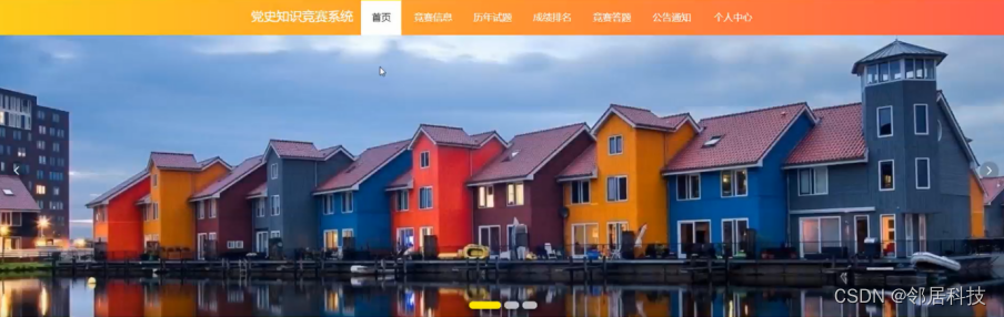 网站首页页面主要包括首页、竞赛信息、历年试题、成绩排名、竞赛答题、公告通知、个人中心等内容,并根据需要进行详细操作;如图5-1所示: