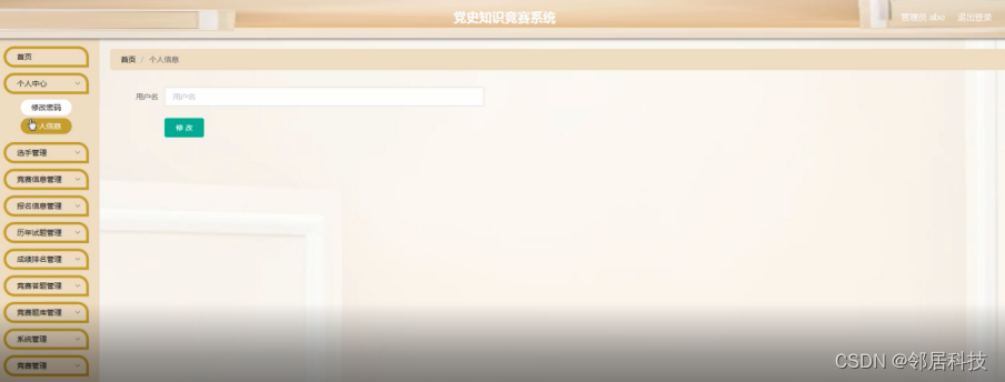 管理员登录系统后,可以对首页、个人中心、选手管理、竞赛信息管理、报名信息管理、历年试题管理、成绩排名管理、竞赛答题管理、竞赛题库管理、系统管理、竞赛管理等进行相应的操作管理,如图5-11所示。