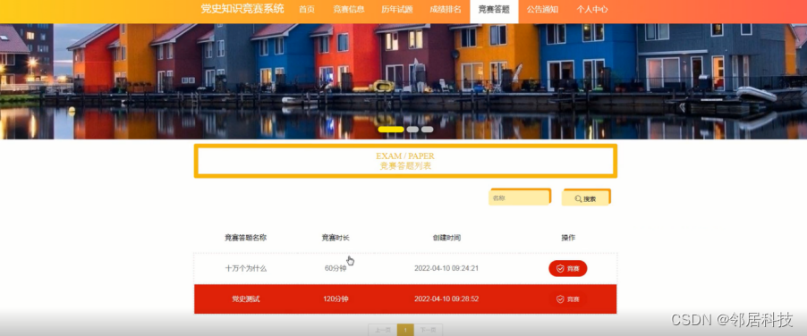 竞赛答题,在竞赛答题页面可以查看竞赛答题名称、竞赛时长、创建时间等内容,如有需要进行竞赛操作;如图5-6所示。