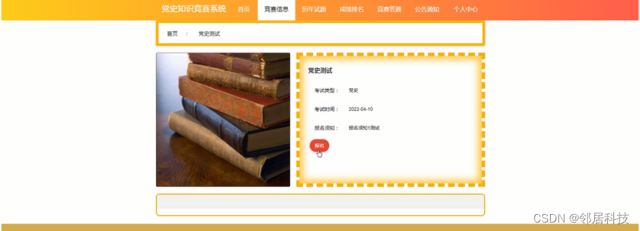 竞赛信息,在竞赛信息页面可以查看考试名称、考试类型、图片、考试时间、报名须知等内容,如有需要进行报名等操作;如图5-4所示。