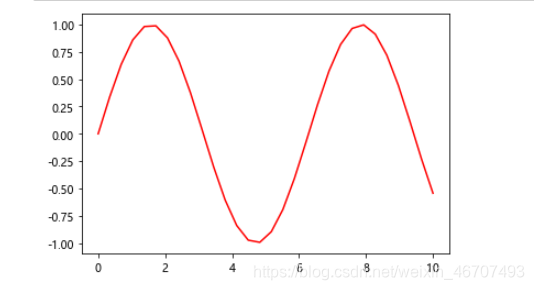 3、简单折线图:以横轴坐标值为x,纵轴坐标值为sin(x),颜色为红色画线