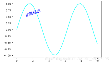 plt.text(x = 1,y = 0.5,s = '这是标注',fontsize = 15,c = 'b',rotation = 20) # rotation控制文本字体角度