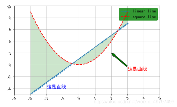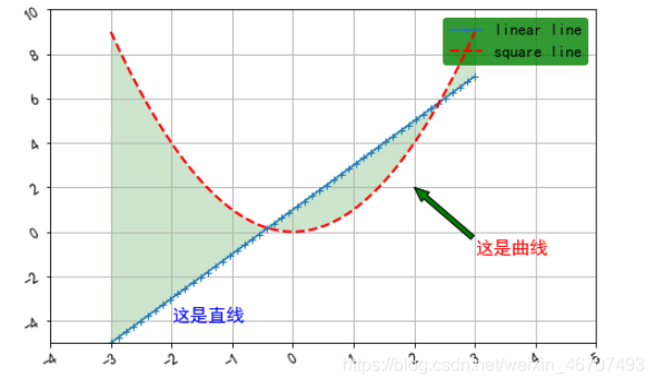 ax.text(-2,-4,'这是直线',fontsize = 15,c = 'b')