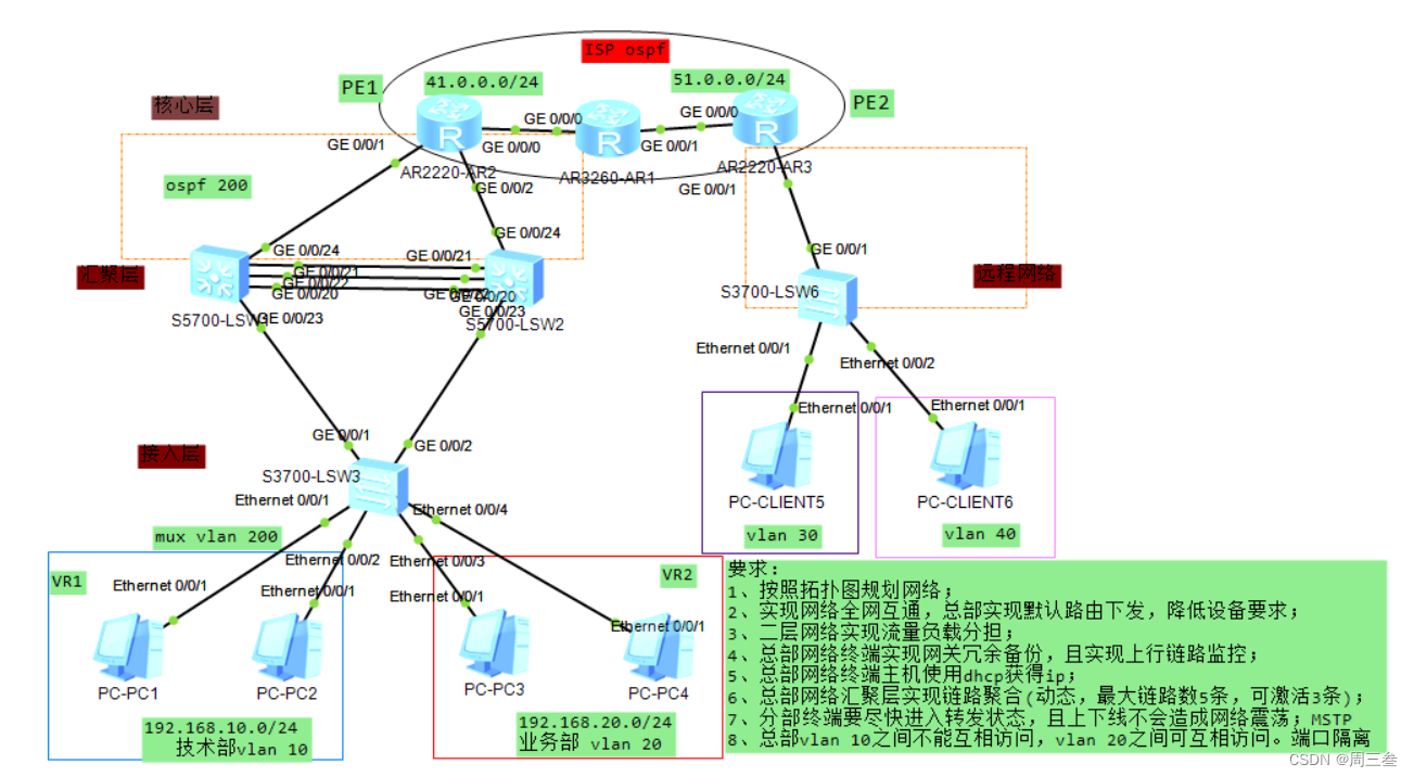 注:1 由于是运营商网络 在LSP中不能出现私网ip因此 vlan 10 20 30 40 使用 MPLS VPN 隧道连接