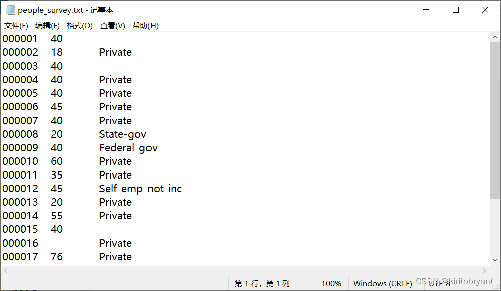 现在有一份社会人员调查信息的数据文件people_survey.txt,由于某种原因,在数据采集的过程中产生了大量的缺失值,文件people_survey.txt的具体内容如图所示。