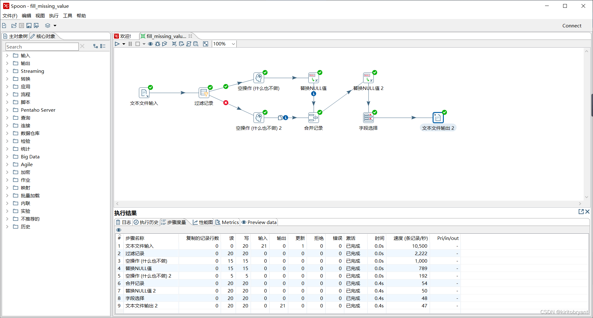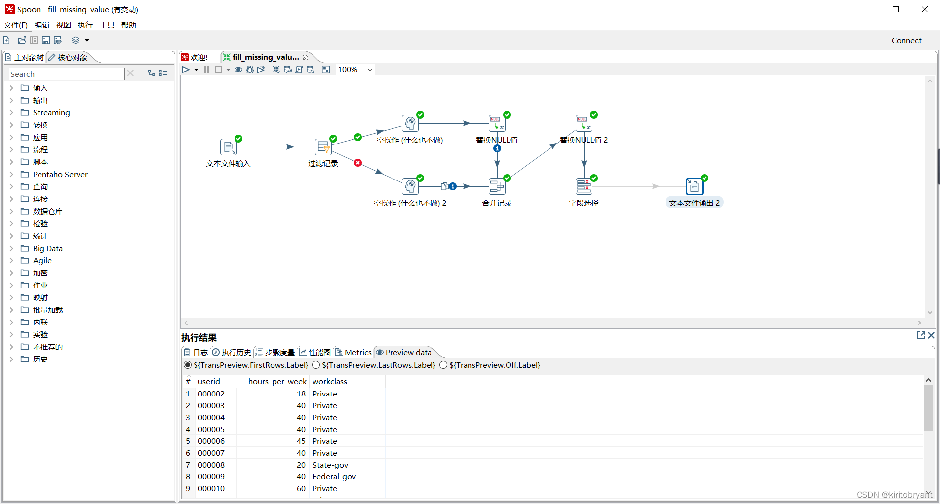 单击转换工作区顶部的运行按钮,运行创建的fill_missing_value转换。