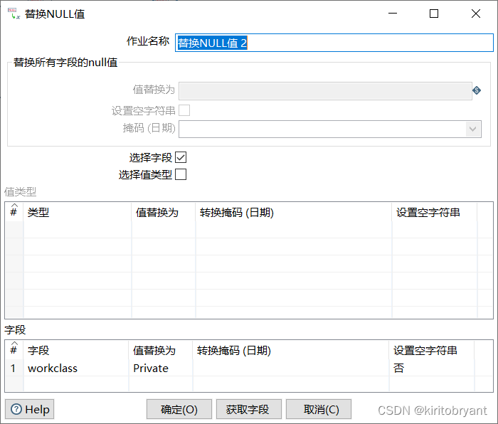 勾选“选择字段”处的复选框,并在“字段”框添加字段为workclass,值替换为Private(这里用Private替换字段workclass中的NULL值)。