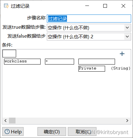 在“发送true数据给步骤:”下拉框中选择“空操作”,将workclass字段值为Private的数据放在“空操作”控件中;在“发送false数据给步骤:”下拉框中选择“空操作(什么也不做)2”,将workclass字段值不为Private的数据放在“空操作(什么也不做)2”控件中。