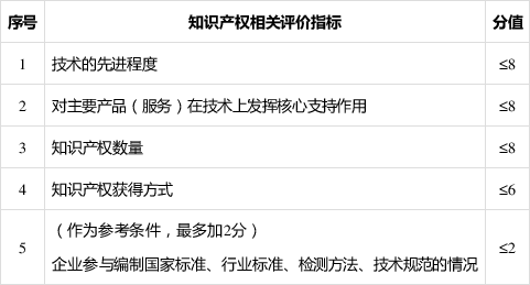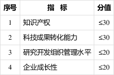 企业创新能力主要从知识产权、科技成果转化能力、研究开发组织管理水平、企业成长性等四项指标进行评价。各级指标均按整数打分,满分为100分,综合得分达到70分以上(不含70分)为符合认定要求。四项指标分值结构详见下表: