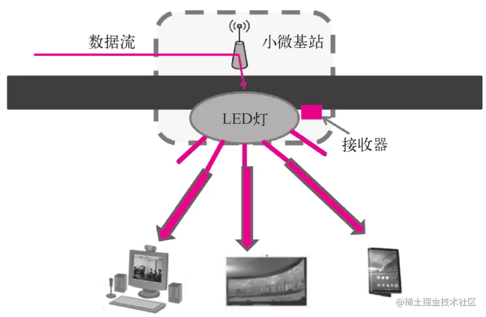 给普通的LED灯泡装上微芯片,可以控制它每秒数百万次闪烁,亮了表示1,灭了表示0。由于频率太快,人眼根本觉察不到,光敏传感器却可以接收到这些变化。二进制的数据就被快速编码成灯光信号并进行了有效的传输。灯光下的计算机,通过一套特制的接收装置传输信号。有灯光的地方,就有网络信号。关掉灯,网络全无。