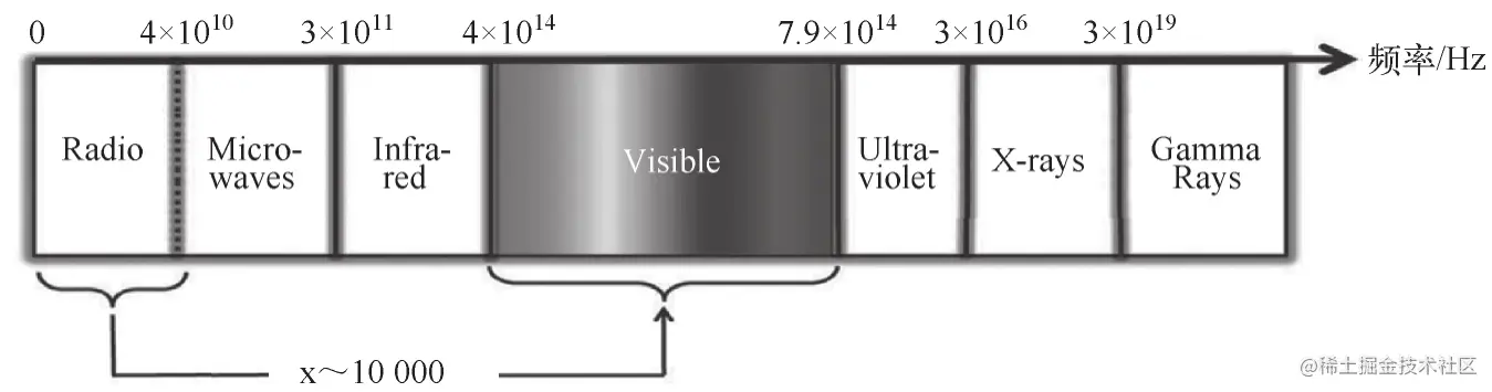 可见光的频率范围4×10e14~7.9×10e14Hz,对应的波长为780~380nm,如图9-32所示。光纤通信的光不是可见光,波长在1200~1600nm区间,该区间的光在光纤中传播损耗最小。可见光在光纤中传导的损耗大,不适合在光纤中应用。