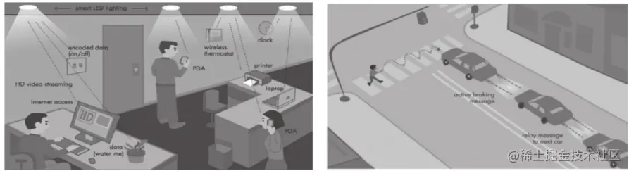 可见光通信在5G中可用于室内短距离通信、车联网通信等,如图9-33所示。