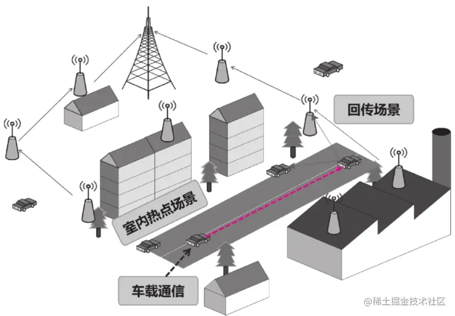 在5G移动通信领域,毫米波主要应用于室内流量热点场景,也用于5G基站与5G基站之间的无线回传,还用于基于D2D(Device to Device,设备到设备)技术的高频通信、车载通信等场景,如图9-30所示。