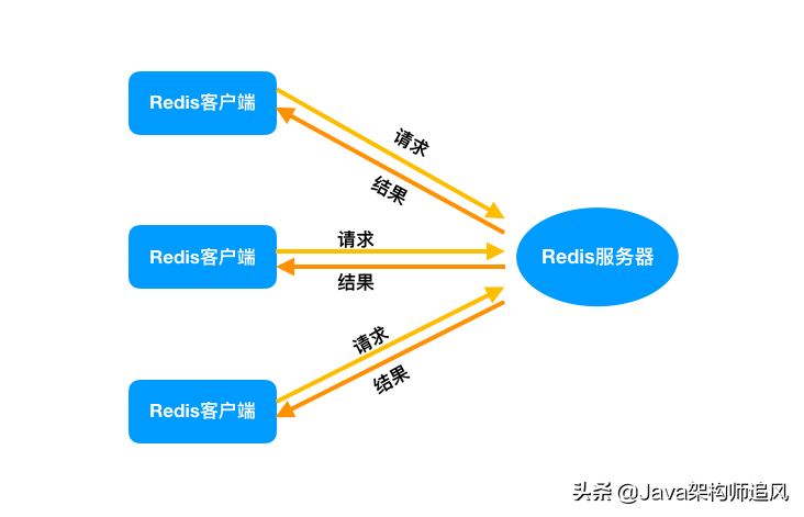 生产环境中的使用,通常是多个客户端连接 Redis,然后各自发送命令至 Redis 服务器,最后服务端处理这些请求返回结果。