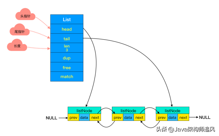 你可能注意到了,头节点里有 head 和 tail 两个参数,分别指向头节点和尾节点。这样的设计能够对双端节点的处理时间复杂度降至 O(1) ,对于队列和栈来说再适合不过。同时链表迭代时从两端都可以进行。