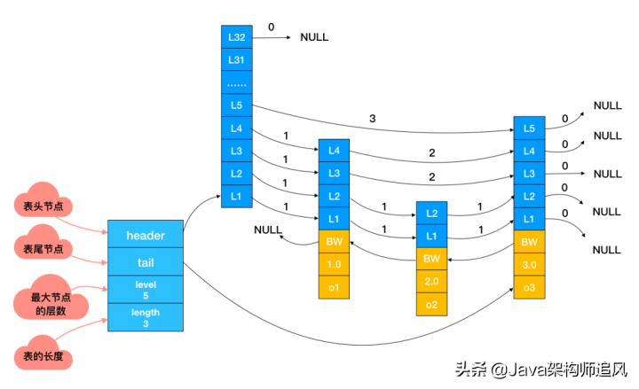 下面这张是跳表真实的存储结构,和其它数据结构一样,都在头节点里记录了相应的信息,减少了一些不必要的系统开销。