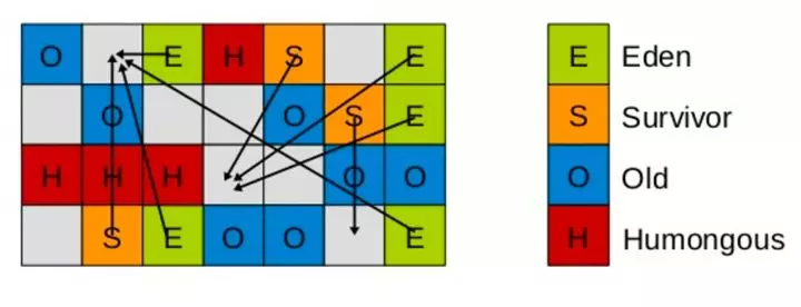 注:Humongous,简称 H 区是专用于存放超大对象的区域,通常>= 1/2 Region Size,且只有 Full GC 阶段,才会回收 H 区,避免了频繁扫描、复制/移动大对象。