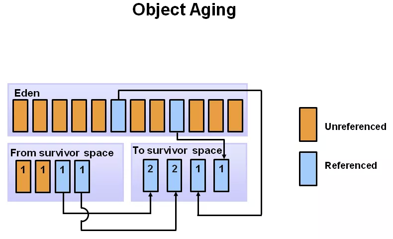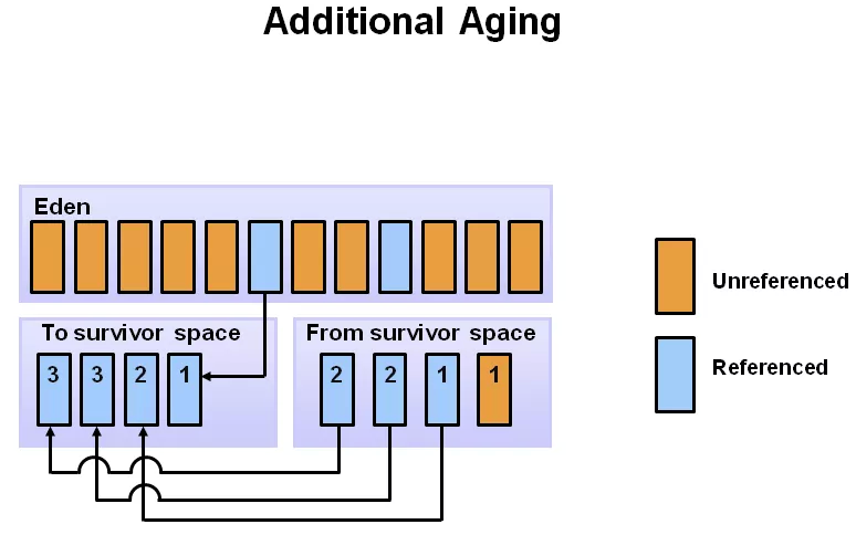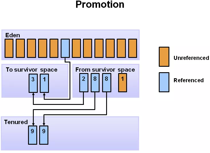 对象在新生代的 3 个区(edge,s0,s1)之间,每次从 1 个区移到另 1 区,年龄+1,在 young 区达到一定的年龄阈值后,将晋升到老年代。下图中是 8,即:挪动 8 次后,如果还活着,下次 minor GC 时,将移动到 Tenured 区。