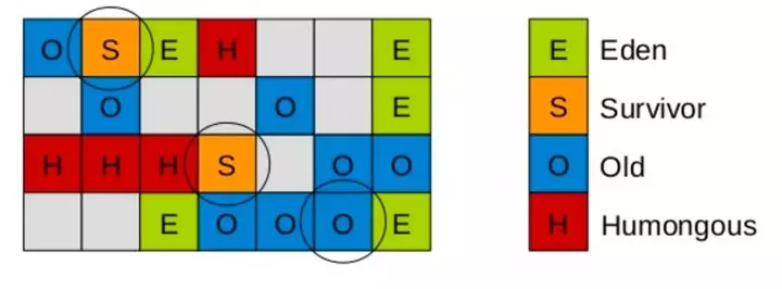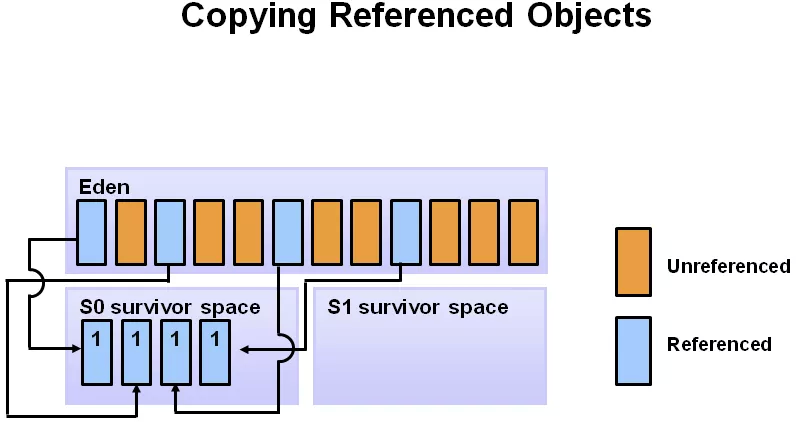 继续,随着对象的不断分配,eden 空可能又满了,这时会重复刚才的 minor GC 过程,不过要注意的是,这时候 s0 是空的,所以 s0 与 s1 的角色其实会互换,即:存活的对象,会从 eden 和 s1 区,向 s0 区移动。然后再把 eden 和 s1 区中的垃圾清除,这一轮完成后,eden 与 s1 区变成空的,如下图。