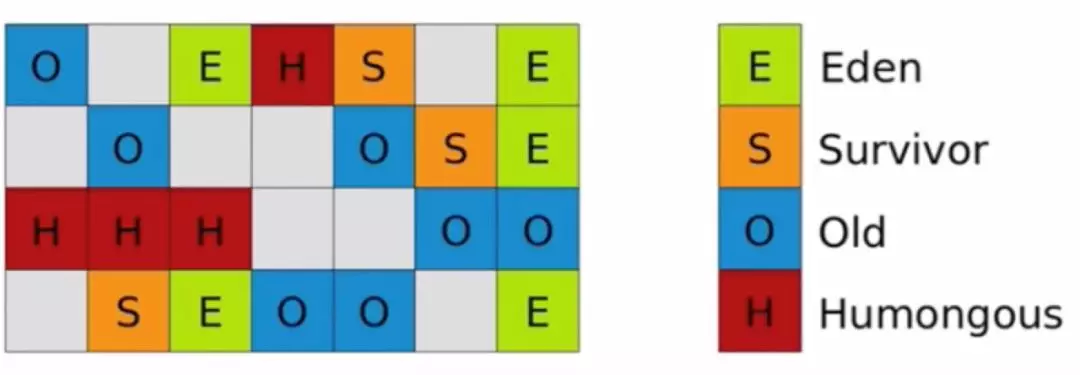 如下图,G1 将 heap 内存区,划分为一个个大小相等(1-32M,2 的 n 次方)、内存连续的 Region 区域,每个 region 都对应 Eden、Survivor 、Old、Humongous 四种角色之一,但是 region 与 region 之间不要求连续。
