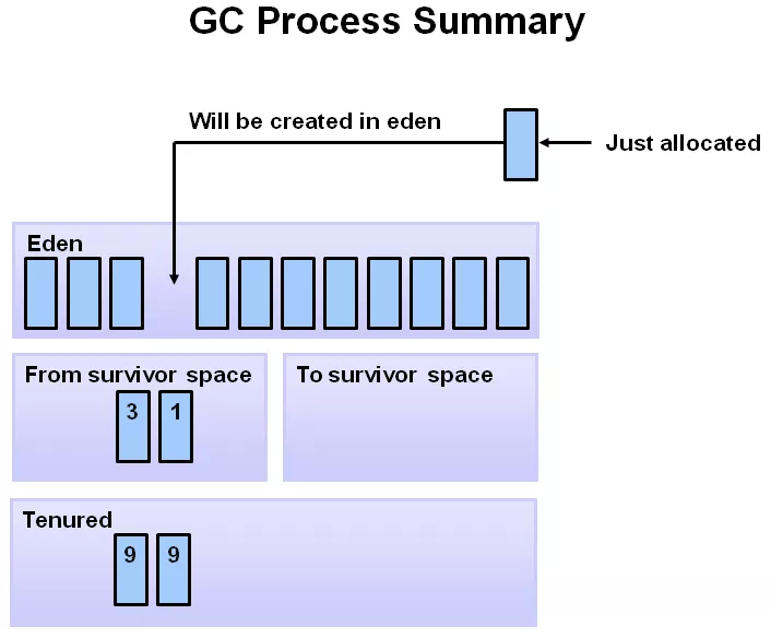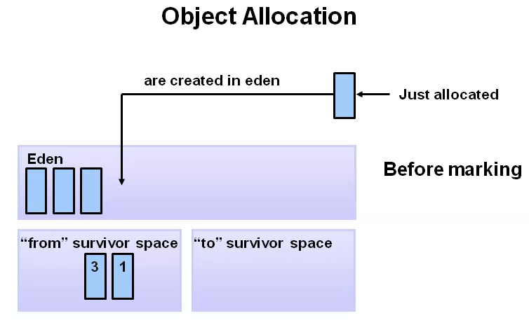 刚开始时,对象分配在 eden 区,s0(即:from)及 s1(即:to)区,几乎是空着。